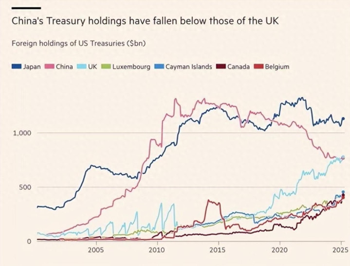 25年来头一遭,中国在美债持有榜上跌出了前二。2025年3月,数据摊牌:中国持仓降至7654亿美元,被英国反超,创下14年新低。